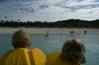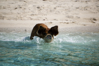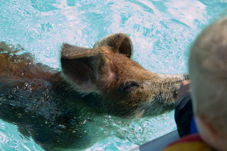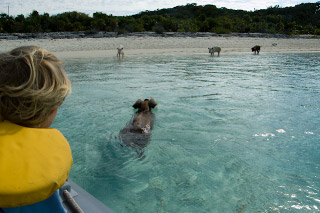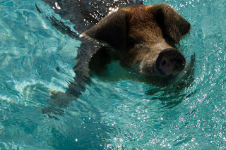 If pigs could swim… they can! We’re anchored between Staniel Cay and Big Majors Spot. We’ve heard about a herd (what do you call a group of pigs?) of feral pigs that live on Big Majors. Apparently someone abandoned the island and the pigs too. Now they’re wild… well, as wild as any pigs that live on handouts from passing boats can be. We dinghy over to “Pig Beach” but we don’t even get the chance to land before the one pig who is known for climbing into dinghies jumps in the water and swims right to us. I have to keep the paddle handy since every so often a cloven hoof pops out of the water aimed for the dinghy. When other cruisers mentioned that one of the pigs tries to climb in dinghies, I figured they meant dinghies that were pulled up on the beach not in the water! I feel a little like President Carter being attacked by a swimming rabbit. The whole scene is pretty amusing but it does feel like we’re on the fringe of something that could turn very ugly. We head off to another beach. Later in the day we hear from another cruiser about a lady who had teeth marks on her arm from the swimming pig that was trying to take the food from her hand and missed. Swimming pigs are best enjoyed from afar… Staniel Cay is the first stop since The store also fills propane tanks (we probably have less than two days worth left on the boat). It’s the end of the day and the shopkeeper says that if I bring the tank back in the morning I can pick it in the afternoon. The next morning I arrive with tank in hand. A different shopkeeper says “We’re all out of propane. No more till next week’s mailboat.” This is a problem! Megan now has a full pantry but if we’re out of propane we’ll have to cook over a bonfire on shore. That might be a little more primitive than we are up for… Doing laundry in buckets is one thing but preparing meals over campfires is pushing it. Apparently the shopkeeper notices the suicidal look that flashes across my face and says, “Well, that’s a small tank. I might have enough to fill that one small tank.” Later in the day I return to the store and fortunately find a full tank. Phew… |